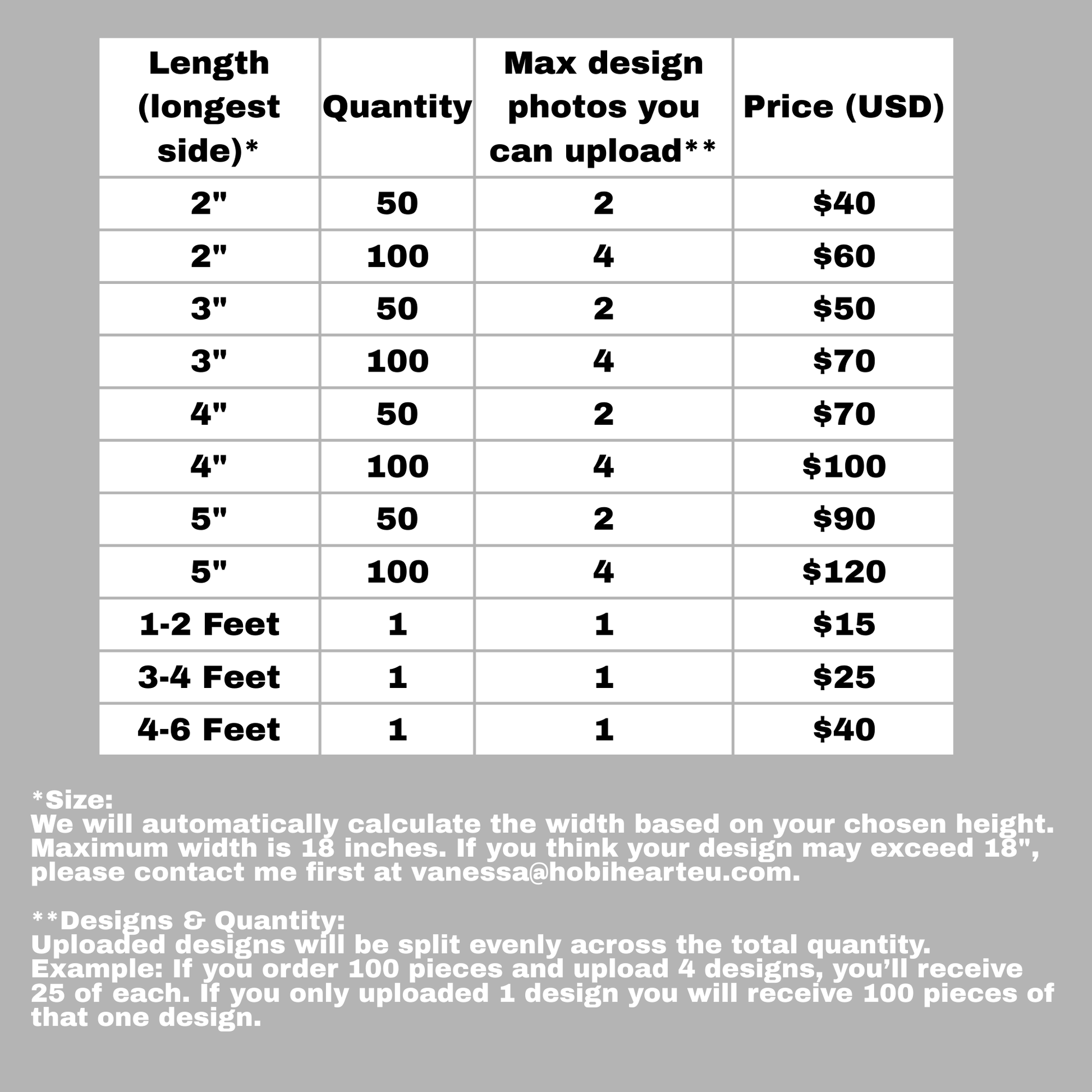 Example: If you order 100 pieces and upload 4 designs, you’ll receive 25 of each. If you only uploaded 1 design you will receive 100 pieces of that one design.
